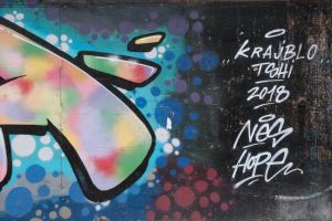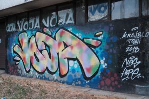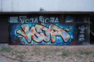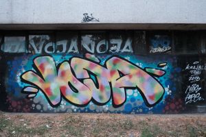 A colourful 2018 piece by Nes and Hope repeats the name “Voja” across the wall, assembling layers of earlier paint into an energetic, almost Pollock-like field. The inscription “Voja” refers to a long-running local practice of repainting the wall in his memory — the final composition integrates those accumulated colours and was accepted by neighbours. The work is documented on FortyFivers blog and shared by Street Art Belgrade.