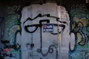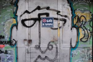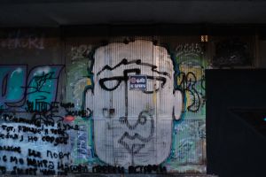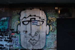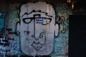A silver-painted face on a metal fence, created in 2015, presents a simplified, cartoon-like portrait executed by an unknown author. The monochrome work relies on minimal lines and the metal surface to define the facial features, giving it a graphic, stencil-like presence on the panels.