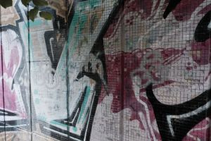 Rendered in bubble letters, this 2012 piece appears to be a collaborative work by Skalp and Dizzy, with an additional nearby tag attributed to Jens. The mural is in poor condition, which has degraded the lettering and prevents a definitive attribution of all signatures.