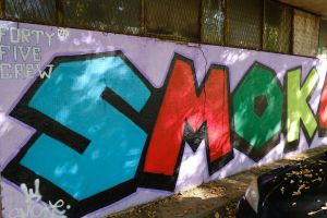 This 2025 piece by Smoke is composed of bold block letters with solid fill and a strong outline, presenting a clean, graphic lettering study. The work appears to have been executed with a probable second collaborator whose identity could not be determined.