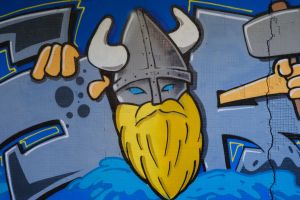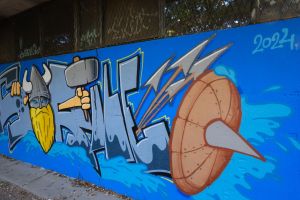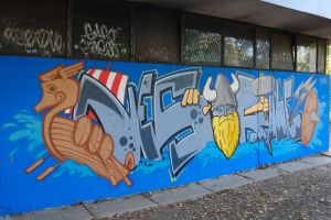 A cartoon-style Viking character dominates this 2024 piece by Nes and Rule. The composition includes a galley and a shield with spears, surrounded by the artists’ tags that frame the scene. The work is documented on the FortyFivers blog and was shared by Fortyfivers45 on Instagram.