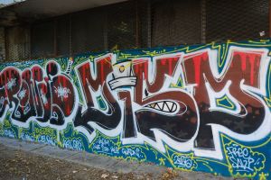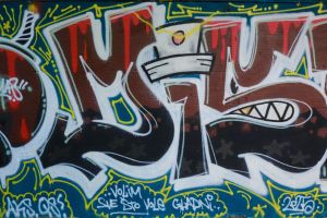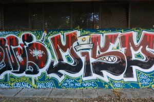 Rendered in intricate wildstyle lettering, this 2025 piece is visually complex, with tightly interwoven letterforms and layered fills. The composition is accompanied by a large number of additional inscriptions and smaller tags that appear to be by an unknown author.