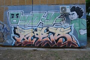 This 2012 piece by Hope, Cash, Jest, and Said is rendered in a Japanese-inspired style and depicts a dynamic fighter character. The paint has faded somewhat, but a clearer photograph is available on Google Maps. The work is also documented by Fortyfivers45 on Instagram.