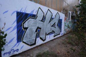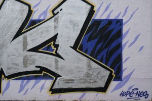 Hope and Nes painted this 2018 piece in sharp-angled lettering, the forms executed in silver letters against a white-and-blue background. The work may be a later restoration, as there is an indication of 1998, but that could not be confirmed. The graffiti is documented on the FortyFivers blog and was shared by Fortyfivers45 on Instagram.