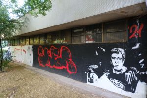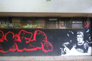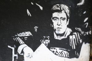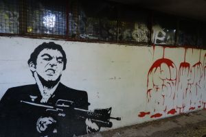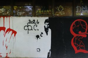 Skiv and Sker created this 2021 piece portraying Al Pacino as “Tony Montana” in a paired stencil portrait composition. The two portraits form a complementary duo rendered in a high-contrast stencil/portrait style. The work is documented by Fortyfivers45 on Instagram and also shared by before sunrise.