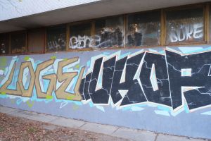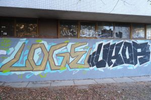 Lettering by Loge and Ukor, created in 2015, presents the painted words “Loge” and “Ukor” rendered in blocky wildstyle forms on a flat gray background. The composition pairs interlocking wildstyle letterforms with bold block shapes, using the neutral backdrop to draw attention to the names.
