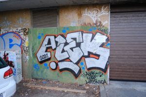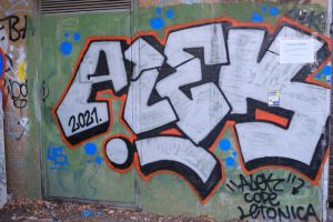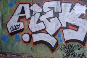 A rounded bubble-letter composition centers on the word “Alek” in this 2021 piece attributed to Code and likely co-signed by Letonica. The painted name is shown with visible quotation marks, so the word “Alek” reads as an intentional quoted inscription within the design.