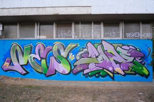 A large collaborative wildstyle 2025 piece by Nes and Hope is painted on a vivid blue background and composed of dense, interlocking letterforms. The composition fills the surface with overlapping shapes and dynamic flow, emphasizing complex linework and layered color.