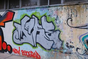 A monochrome piece rendered in bold block letters, with strong, simplified letterforms and minimal color variation. The work is by an unknown author and has been tentatively attributed to Moresko, although that identification remains uncertain. The graffiti is visible on Google Maps, indicating that it existed no later than 2014.