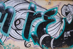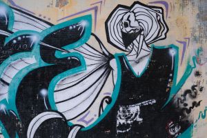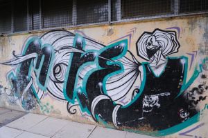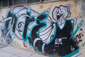 A 2012 piece by Moresko depicts an illustrative character, likely wearing a dress whose skirt deliberately forms the letter O. The work reads as a character-driven piece with simple, graphic shapes that emphasise the circular hem. The graffiti is documented on the Streetpins and is also visible on Google Maps.