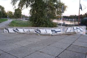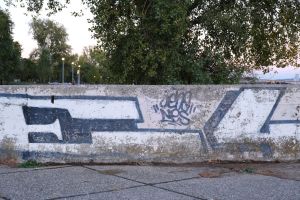 A historic 2013 piece by Jens and Nes is painted on a concrete staircase by the embankment, executed in bubble-outline letters that spell “Nine” alongside the number “45”. The work is documented on the FortyFivers blog and was shared by Fortyfivers45 on Instagram.
