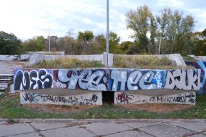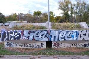 A collaborative throw-up and tag executed by Nes, Dime, Vasa, and Urke occupies the ramp leading down to the embankment. The composition is built from quick, bold lettering and overlapping tags that reveal multiple hands and rapid application. Its placement on the descent makes the work highly visible to pedestrians approaching the waterfront.