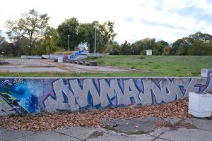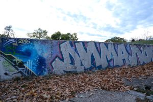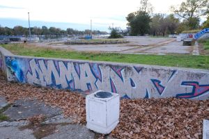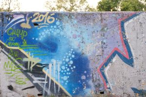 This 2016 graffiti by Loge and Deeman consists of name inscriptions applied to a concrete staircase along the embankment. The painted names “Дима” and “Логе” are executed in block-letter throw-up forms with a pronounced outline, emphasizing bold, legible shapes on the stair plane.