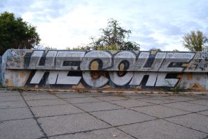 Rendered in a blockbuster, monochrome style, this 2013 piece by Nes presents the name in Cyrillic as “НЕС ОНЕ” on the descent to the waterfront. The bold, single-color letters form a straightforward typographic piece, and the work is documented on FortyFivers blog.