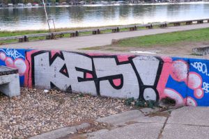 Painted in a compact throw-up and block-letter style, this 2025 piece by Vasa and Urke features the inscription “Kej” on the concrete railings of a recreational embankment, likely referencing the nearby riverside quay. The graffiti is documented by Blok Kultura.