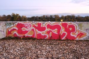 A red throw-up rendered in bubble-letter style forms this 2025 piece of unknown authorship. Painted in red with a contrasting outline on concrete railings along the embankment, the inscription is densely filled and difficult to decipher. The compact, rounded letters and rapid outline suggest a spontaneous, tag-like execution that prioritizes speed over legibility.