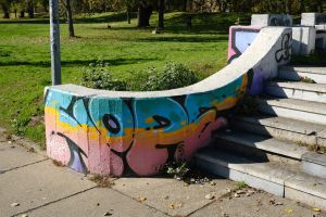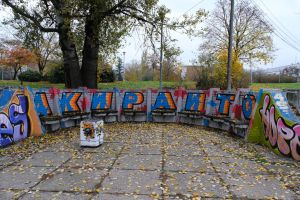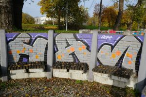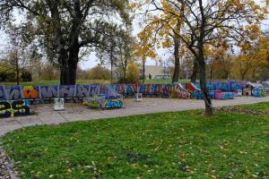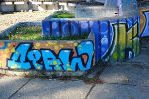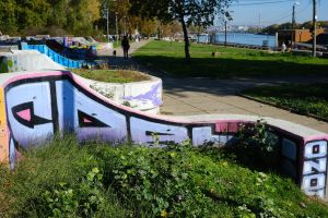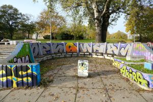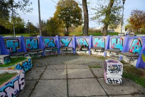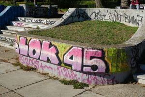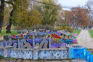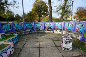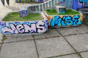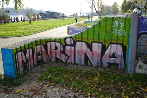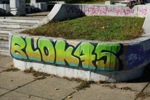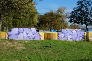 This 2023 collaborative piece by Nes, Hope and Cash covers a series of circular panels known locally as krugove on the embankment, combining block-lettered zones with throw-up style tags. The composition contains a large number of inscriptions, pseudonyms and references, with one area painted as the letters forming “тићулица”, another reading “akiroito”, and a third likely saying “original”. Photographs of the work are published on the FortyFivers blog.