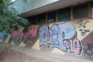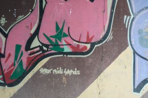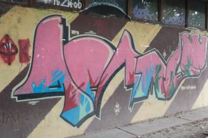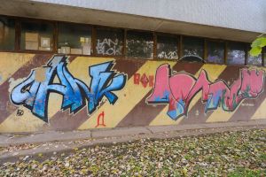 A composition of multiple graffiti is painted across a unified brown-and-yellow diagonal striped background, with bubble-style lettering that reads as a cohesive piece. The work is likely by the AFO Crew. The graffiti is visible on Google Maps, indicating that it existed no later than 2014.