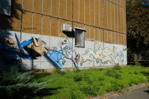 A collaborative composition by Demon and Hope features alien-like characters integrated with bold, three-dimensional lettering, merging contributions from different authors into a single piece. The work is documented on Walls of Belgrade Flickr and is included in the third edition of the Street Art Belgrade book. The graffiti is visible on Google Maps, indicating that it existed no later than 2014.
