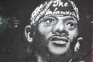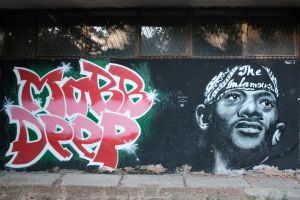This 2020 piece by Juice and Kivi KC is a black-and-white, photorealistic mural that features a large portrait of Prodigy accompanied by the painted inscription “Mobb Deep”. The work is documented on STAWBelgrade Instagram and is also featured on the FortyFivers blog.