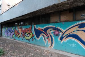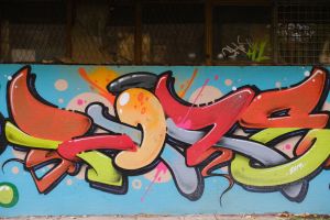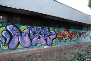 This 2019 piece by Piros, Nes and Hope is a colorful, 3D bubble-letter composition painted on a flat cyan background and lacks a bright character. The work is documented on FortyFivers blog and shared by Petar Popović on Instagram and before sunrise.