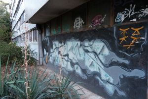 Rendered in a spare monochrome style, this 2014 graffiti by Moresko pairs abstract lettering with a small character positioned to the left of the inscription. The figure provides a visual counterpoint to the letters and helps define the composition. The work is documented on Streetpins and is visible on Google Maps.