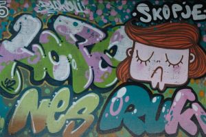 This 2012 piece by Hope, Nes, and Ruki depicts a girl character that Ruki often uses, set beside bubble-style lettering which includes the painted inscription “Skopje”. Ruki is originally from Skopje, which explains the inclusion of that word on the wall. The work is documented on before sunrise and is also shared by Fortyfivers45.